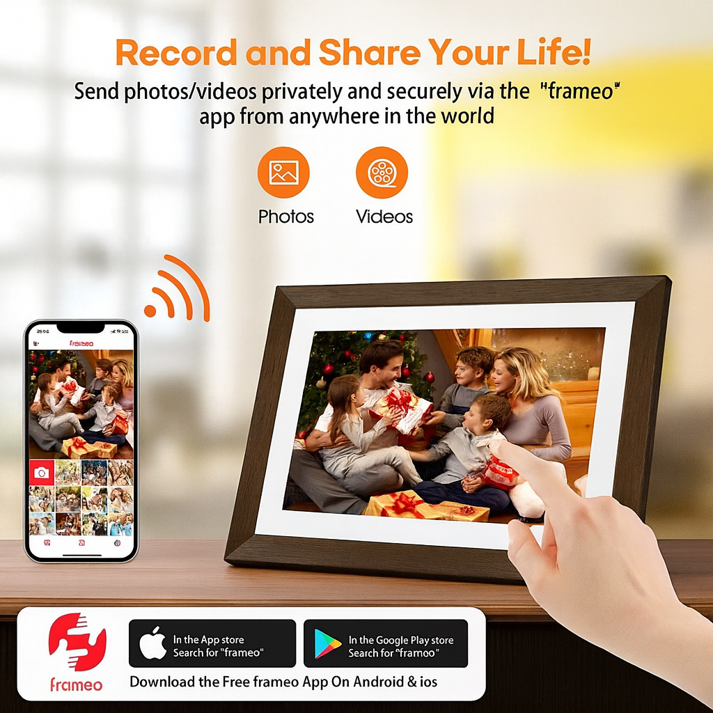 With the Frameo app, you can send photos and videos directly from your phone to the digital frame in just a few staps. Whether you're acrooss the country or right next door your memories instantly appear on the screen as if you delievered them in person. It's the easiest, fastest way to stay connected with the people who matter most.